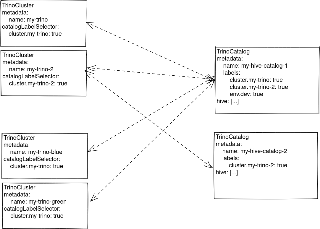 Every TrinoCatalog object provides a set of labels. The TrinoCluster objects provide a LabelSelector which defines which catalogs should be included in the Trino instance.
