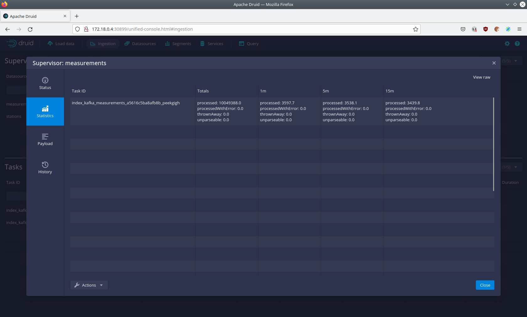 The statistics show that Druid is currently ingesting 3597 records/s and has ingested ~10 million records so far.